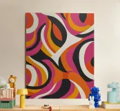 Un audace motivo astratto con un tocco di energia dinamica che simboleggia il movimento e la fluidità. Colori vivaci che evocano temi come l'acqua, la vita e il movimento. Una fusione innovativa di tradizione e modernità per interni contemporanei e minimalisti. Un linguaggio visivo unico che supera i confini culturali.