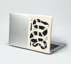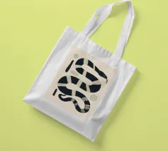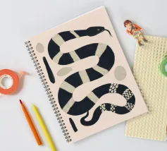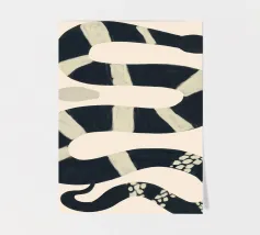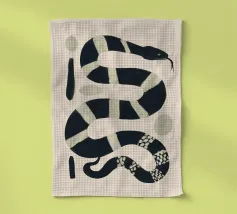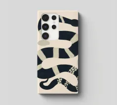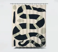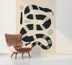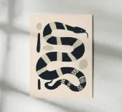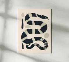 Un serpente minimale e stilizzato in bianco e nero, arrotolato in morbide curve su uno sfondo neutro.