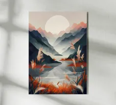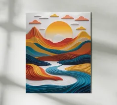 Un dipinto paesaggistico vibrante e astratto di un fiume tortuoso che scorre attraverso una maestosa catena montuosa. I colori audaci e le forme geometriche creano un'opera di grande impatto visivo e accattivante.
