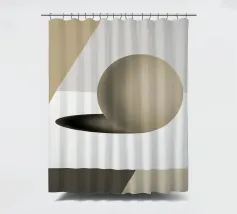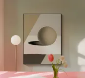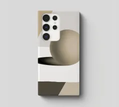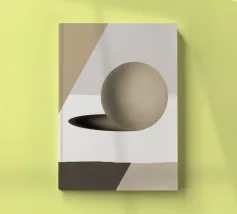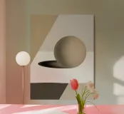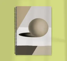 Una sfera poggia su una superficie piana, proiettando un'ombra su un lato, circondata da forme geometriche in toni neutri. L'uso di luci e ombre aggiunge profondità e dimensione alla composizione.
