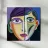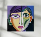 This artwork depicts a person with purple hair and a dark background. The use of bold lines and colors creates a striking and intense gaze.