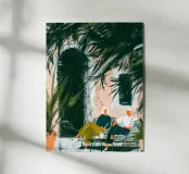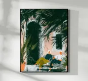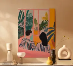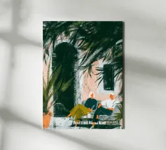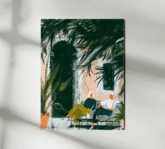 Quest'opera d'arte figurativa contemporanea cattura un momento intimo di riposo e conversazione sotto un fitto fogliame espressivo. Due figure sedute sono rese con forme semplificate e pennellate strutturate, sullo sfondo di una facciata calda e lavata dal sole, ammorbidita da verdi profondi e toni smorzati di terracotta. Il contrasto tra ombra e luce evoca il ritmo tranquillo di un pomeriggio mediterraneo, in cui il tempo rallenta e la presenza diventa protagonista. Le texture pittoriche e la sobria armonia dei colori creano un senso di calma intimità e profondità emotiva. Ideale per interni moderni, caffè o collezioni d'arte curate.