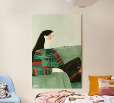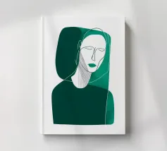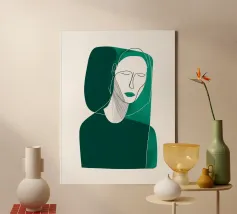 Una figura femminile serena emerge da sfumature smeraldine stratificate, definite da un'unica linea continua che ne traccia l'espressione calma. Il verde intenso contrasta con i delicati contorni del viso, creando un equilibrio tra solidità e morbidezza. La tavolozza sobria invita alla quiete, mentre le sottili variazioni di texture aggiungono profondità alla composizione minimalista. Quest'opera cattura una presenza interiore tranquilla - composta, radicata e contemplativa - pensata per portare eleganza moderna e calma negli spazi contemporanei.