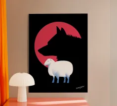 Questa illustrazione unica presenta una pecora e un lupo uno accanto all'altro, raffigurando un'amicizia inaspettata e la bellezza dell'accettazione.