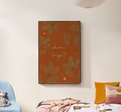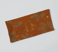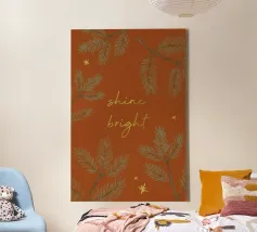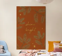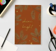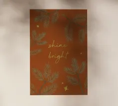 An illustration for the winter season! A reddish brown background with pine twigs, stars and the text "Shine bright" in golden look. (Not goldfoil!)