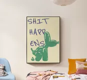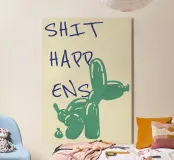 Dieses originelle Pop-Art-Poster kombiniert Humor mit kreativem Design! Die witzige Darstellung eines Ballonhundes, der eine unerwartete Überraschung hinterlässt, wird durch die lässig-handgeschriebene „Shit Happens“-Message perfekt ergänzt. Die Kombination aus satten Farben und einem Comic-inspirierten Stil macht dieses Kunstwerk zur idealen Wanddekoration für moderne, trendige Räume, Büros oder als lustiges Geschenk für Freunde mit Sinn für Humor.