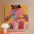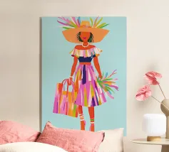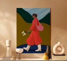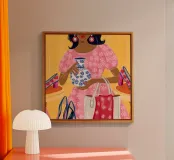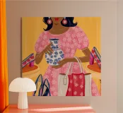 This painting showcases a person in a pink dress holding a vase and a handbag, surrounded by shelves with colorful items in a boutique. The scene highlights elegance and modernity.