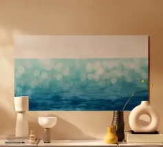 Morbido, arioso e rilassante, questo acquerello cattura le sfumature stratificate del mare e della nebbia. I delicati gradienti di turchese, acqua e azzurro invitano a un senso di apertura, ideale per interni simili a spa, rifugi costieri o case minimaliste che abbracciano la luce e la tranquillità.