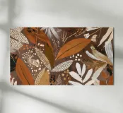 Foglie color terra di Siena e ocra si mescolano con il bianco e i puntini botanici, dipinti con pennellate stratificate che suggeriscono la ricchezza della terra e della crescita autunnale.
