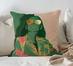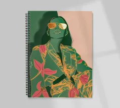 Una giovane donna elegante in un elegante tailleur pantalone con motivo floreale e occhiali da sole irradia un'eleganza moderna. I capelli lunghi e gli accenti dorati conferiscono al ritratto un tocco fresco e contemporaneo.