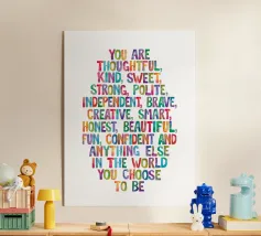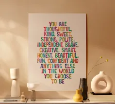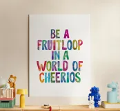 Aggiungete un tocco di bizzarria al vostro spazio con questa affascinante stampa tipografica. La giocosa frase "Be a Fruitloop In a World of Cheerios" prende vita in una vivace scritta acquerellata arcobaleno dipinta a mano, su un nitido sfondo bianco. Questo pezzo accattivante è un delizioso promemoria per abbracciare la propria unicità e distinguersi dalla massa. Perfetta per ravvivare qualsiasi ambiente, dalla cameretta dei bambini all'ufficio di casa, questa coloratissima opera d'arte susciterà sicuramente gioia e conversazione. Lasciate che questa stampa allegra vi ispiri a celebrare la vostra individualità ogni giorno.