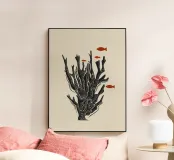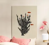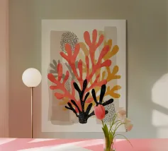 Questo accattivante poster in stile linoleografico mostra l'intricata bellezza di una formazione corallina, accompagnata da piccoli pesci rossi che nuotano con grazia intorno ad essa. L'audace silhouette nera del corallo contrasta nettamente con il delicato movimento dei pesci, simboleggiando l'armonia e la fragilità della vita marina. Le texture intagliate a mano aggiungono un'atmosfera grezza e organica, rendendo quest'opera d'arte perfetta per gli amanti degli oceani, per i sostenitori della conservazione o per chiunque apprezzi il design ispirato alla natura.