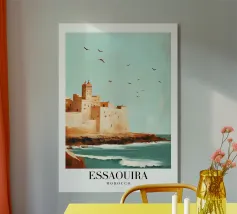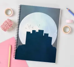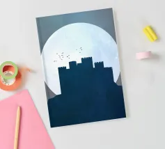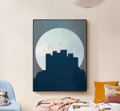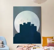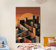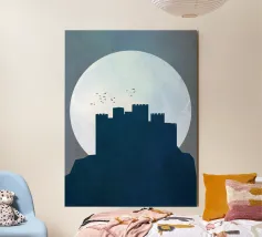 Questa illustrazione moderna presenta una cittadella solitaria che si staglia contro una luna vasta e pallida, con uccelli che si muovono tranquillamente nel cielo. I toni freddi del blu e le texture sottili creano un'atmosfera serena e contemplativa, evocando temi di solitudine, resistenza e tranquilla vigilanza. La composizione minimalista e i morbidi contrasti rendono quest'opera d'arte un'aggiunta raffinata a interni moderni, scandinavi o ispirati alla fantasia.