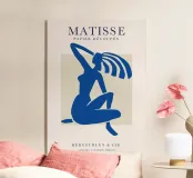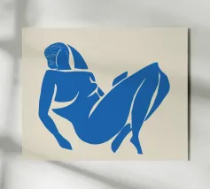 silhouette donna figura seduta ritaglio forme astratte linee decise colori piatti poster copertina di libro d'arte posa espressiva colore blu dettaglio minimo arte grafica testo di testa colori complementari studio della figura forma semplice materiale di marketing pubblicità arte moderna