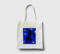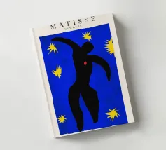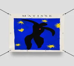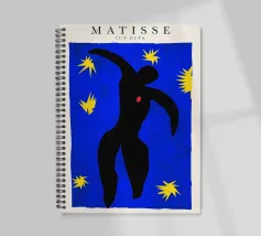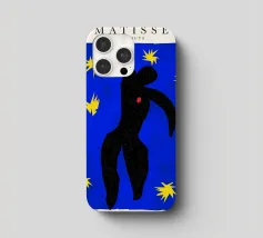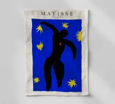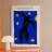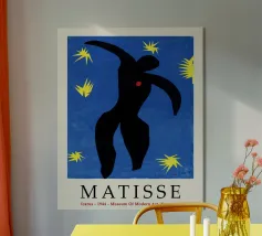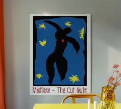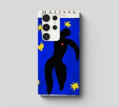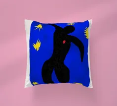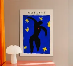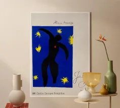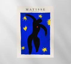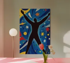 blue background black silhouette yellow stars red dot dancer figure movement cut-out shape negative space motion figure limbs dancing pose bold colors contrast abstract form simplistic design energetic posture yellow bursts night sky organic form
