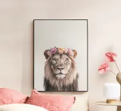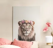 Il ritratto di un leone mostra grandi occhi espressivi e una colorata corona di fiori. La morbida pelliccia è perfettamente accentuata in un'illustrazione fotografica minimalista e cattura lo straordinario fascino della natura. Ideale per gli amanti degli animali.