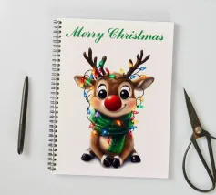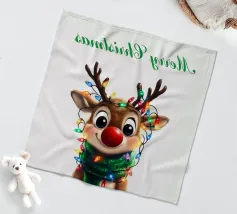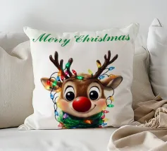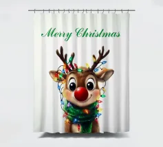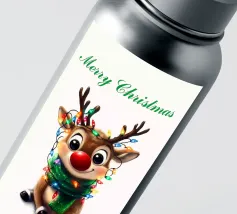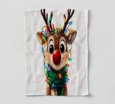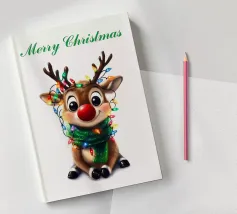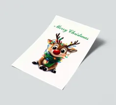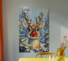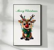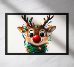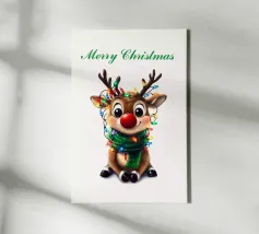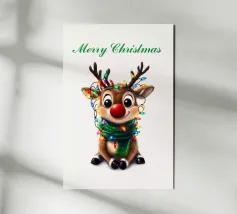 Rudolf, la simpatica renna dal naso rosso e dagli occhi grandi, brilla in un'affascinante illustrazione in stile cartoon circondata da luci fatate colorate. Questa simpatica opera d'arte natalizia unisce perfettamente decorazioni festive e arte minimalista e diffonde un'allegra atmosfera di "Buon Natale".