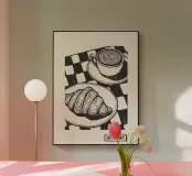 Un'elegante illustrazione in bianco e nero in stile linoleum di un caffellatte mattutino con intricata latte art, abbinato a un croissant sfogliato su una tovaglia a scacchi. Il design pulito e monocromatico aggiunge un tocco minimalista e senza tempo, perfetto per le cucine moderne, le caffetterie e i bar. Un regalo prezioso per gli amanti del caffè, i baristi e gli appassionati della prima colazione.