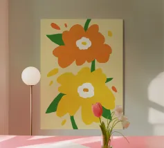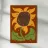 Un girasole stilizzato presenta petali giallo caldo e un centro marrone, su uno sfondo rosso ruggine. Lo stelo e le foglie verdi sono rappresentati con linee semplici e fluide.