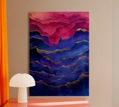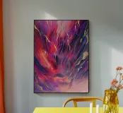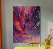 This vibrant abstract painting features a dazzling interplay of reds, purples, and gold, evoking a sense of cosmic energy and celestial beauty.