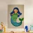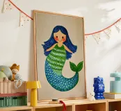 L'illustrazione mostra un'allegra sirena con lunghi e fluenti capelli blu, guance rosee e un ampio sorriso. La sua parte superiore ricorda le squame di un pesce e la sua pinna caudale è blu con accenti verdi. Lo stile è giocoso e infantile, con linee pulite e colori vivaci. La texture sullo sfondo conferisce all'immagine un tocco artigianale e affascinante.
