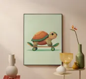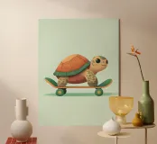 Una tartaruga adorabile e giocosa, che cavalca con sicurezza uno skateboard, incarna lo spirito di avventura e divertimento. Questa illustrazione stravagante riunisce colori vivaci e una scena dinamica e spensierata. L'affascinante sorriso della tartaruga e le linee morbide dello skateboard creano un'atmosfera gioiosa, rendendola un'opera perfetta per chi cerca un mix di natura ed energia giocosa. Realizzata con texture morbide e vivaci tonalità pastello, quest'opera d'arte è divertente e commovente, ideale per le camere dei bambini o per qualsiasi spazio che necessiti di un tocco di allegria.