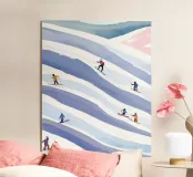 Pista da sci a strisce bianche e viola con sciatori. Dipinto. Generato con AI (Canva).