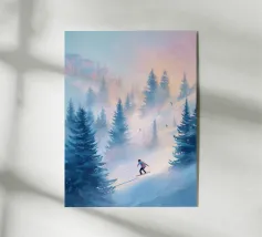 Bella pista da sci tranquilla con neve e alberi colorati leggermente di viola. Generato con AI (Canva).