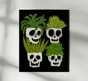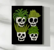 Playful design featuring quirky skull pots filled with lush, leafy houseplants. Perfect for plant lovers with a sense of humor, this unique pattern adds a touch of fun and edgy charm to any space.