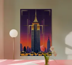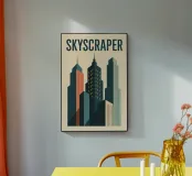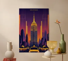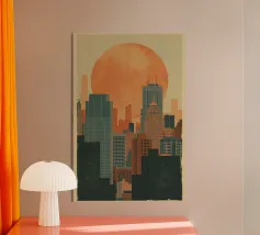 Grattacieli stilizzati dai colori intensi per un'immersione grafica nello skyline moderno. Questo poster rende omaggio all'architettura verticale e al ritmo delle grandi città, con la sua combinazione di potenza architettonica ed eleganza minimalista.
