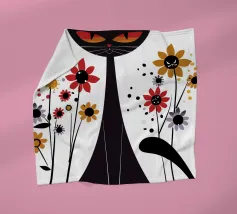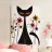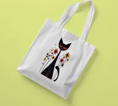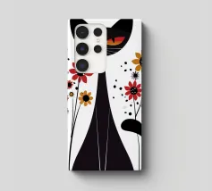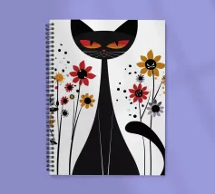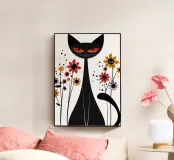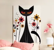 Un elegante gatto nero dai tratti spigolosi siede in mezzo a una colorata composizione di fiori stilizzati di varie forme e colori. Gli occhi del gatto sono straordinariamente rossi, aggiungendo un elemento di mistero alla scena vibrante e stravagante.