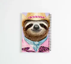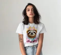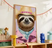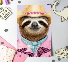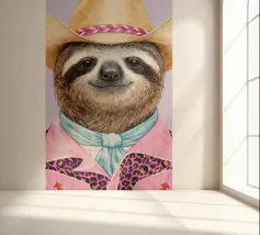 Un bradipo rilassato vestito da cowboy, con tanto di cappello, camicia e fascino scanzonato.