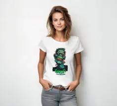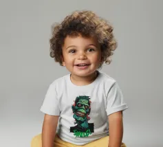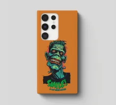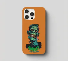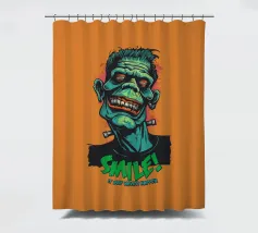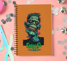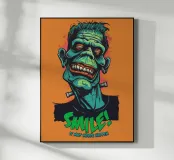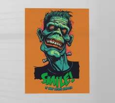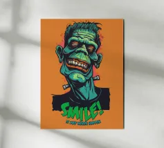 Un'illustrazione colorata e in stile cartoon di un mostro sorridente ispirato a Frankenstein, con pelle verde e denti esagerati. Il design vivace presenta una scritta in grassetto che recita "SMILE! It May Never Happen" in un tono giocoso e spettrale.