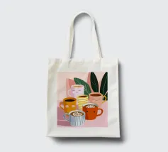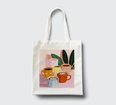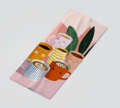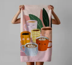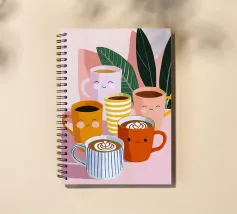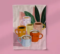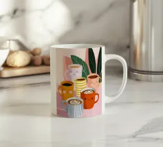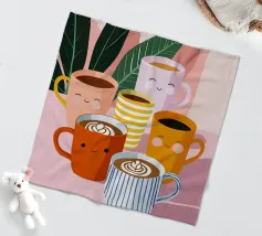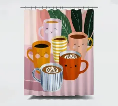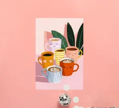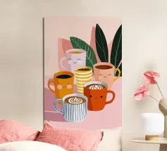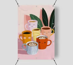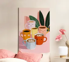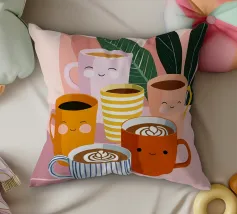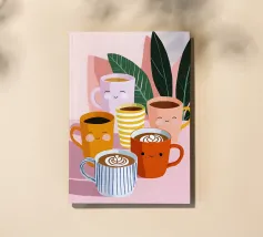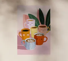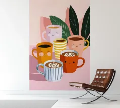 Illustrazione giocosa di sei allegre tazze da caffè con facce simpatiche e cremose decorazioni latte art. Una brillante tavolozza di colori pastello trasmette l'atmosfera accogliente di una caffetteria e una gioia immediata.