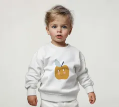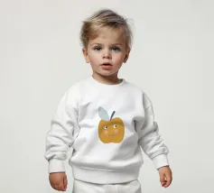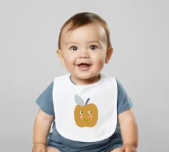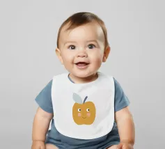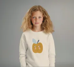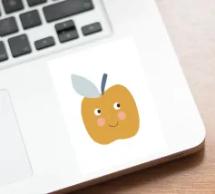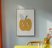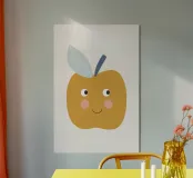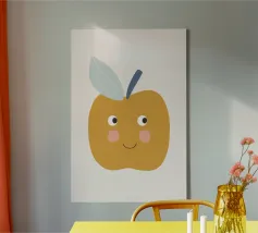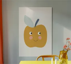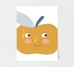 Una graziosa illustrazione di una mela sorridente in un caldo giallo senape con dolci guance arrossate e piccoli occhi espressivi. Caratterizzata da un picciolo blu scuro e una foglia blu tenue, questa giocosa opera d'arte raffigurante un frutto è perfetta per decorare le pareti della cameretta dei bambini, l'arredamento della loro stanza e gli allegri spazi della sala giochi.