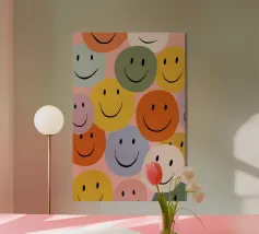 Il motivo colorato Faccine sorridenti è un semplice ma accattivante motivo luminoso nei colori rosa, arancione, giallo e rosso. Presenta molte facce sorridenti che mettono di buon umore. Motivo felice e ottimista ispirato allo stile retrò anni '70 di showmemars