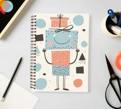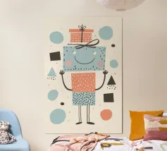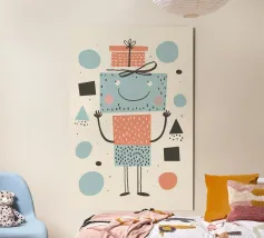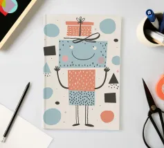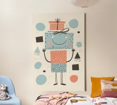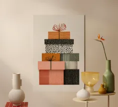 Un'affascinante illustrazione minimalista con una gioiosa confezione regalo trasformata in un simpatico personaggio. Le morbide tonalità pastello, le texture disegnate a mano e le semplici forme geometriche creano un'atmosfera natalizia calda e giocosa.