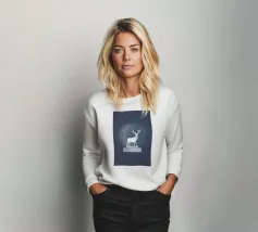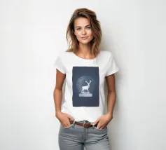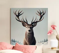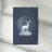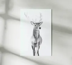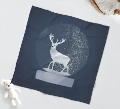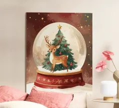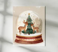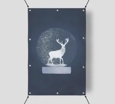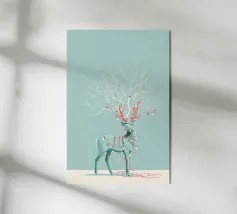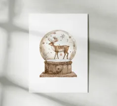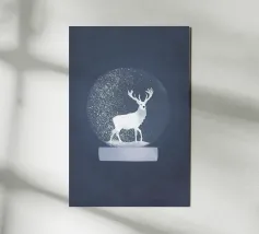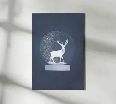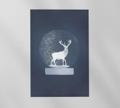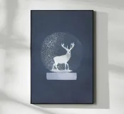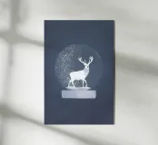 Un poster per i giorni bui dell'inverno e del Natale, con un cervo con le corna nel cielo notturno, che sembra camminare in una palla di neve.