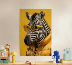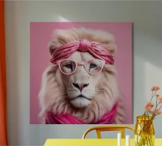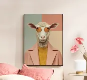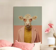 Un raffinato ritratto antropomorfo che fonde la calma pastorale con l'eleganza contemporanea. La pecora, vestita con un caldo maglione lavorato a maglia e un cappotto rosa su misura, guarda lo spettatore con tranquilla sicurezza attraverso occhiali color ambra. Lo sfondo geometrico pastello esalta la composizione minimalista, creando un'opera d'arte sofisticata ma giocosa che celebra l'individualità, lo stile e il gentile umorismo. Perfetta per interni moderni che cercano carattere senza rumore visivo.