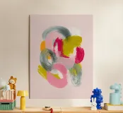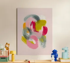 Un'opera d'arte astratta armoniosa, composta da forme circolari sovrapposte e texture pittoriche. La delicata palette di colori crea un punto focale tranquillo che si integra perfettamente in interni minimalisti o moderni.