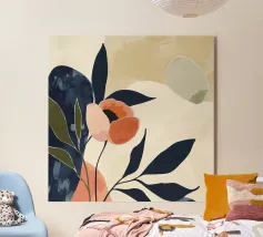 Un'illustrazione floreale minimalista composta da forme morbide e sovrapposte e delicate tonalità pastello. La rappresentazione essenziale di fiori, foglie e colline trasmette calma, leggerezza e una sensazione di crescita silenziosa. Le trasparenze e i colori armoniosi fanno quasi fluttuare il motivo e creano un'atmosfera calda e accogliente. Un'immagine che parla di nuovi inizi, consapevolezza e bellezza delle forme semplici.