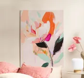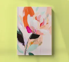 This abstract floral artwork captures a large, expressive bloom painted in soft blush, cream, coral, and gentle green tones. The loose brushstrokes and layered colors create a sense of natural movement, as if the flower is slowly opening. Light, airy, and modern, this piece brings warmth, softness, and a fresh, uplifting feeling to contemporary interiors.