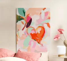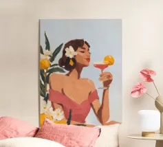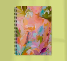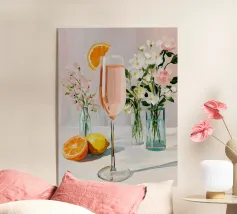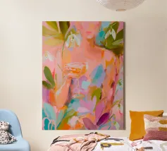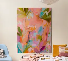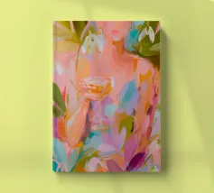 Questo espressivo dipinto contemporaneo ritrae un'elegante figura femminile che tiene in mano una coppa di champagne, circondata da bucaneve in fiore e vibranti forme botaniche. Le pennellate sciolte e gestuali e la tavolozza luminosa di rosa, pesche, verdi e blu tenui creano un senso di intimità e di tranquilla celebrazione. La figura si fonde delicatamente con l'ambiente floreale, suggerendo l'armonia tra emozione interiore e bellezza naturale. Gli strati testuali e il movimento fluente evocano calore, grazia e presenza mentale, rendendo quest'opera d'arte ideale per interni raffinati, spazi lifestyle o collezioni di arte moderna.