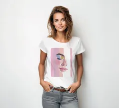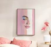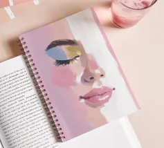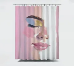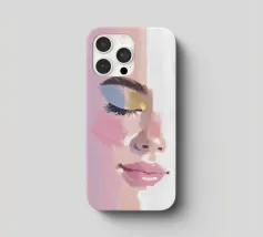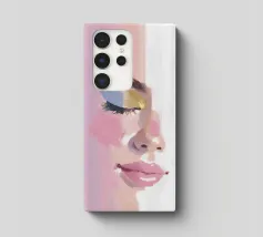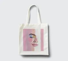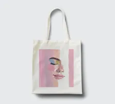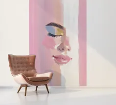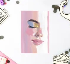 Un ritratto femminile in primo piano, in rosa blush. Le pennellate strutturate e pittoriche e le labbra lucide incontrano i toni morbidi della pelle; l'occhio rimane chiuso in una calma messa a fuoco, accentuata da un ombretto blu e oro.