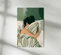 Questo ritratto contemporaneo cattura un momento di tranquilla introspezione grazie a texture pittoriche morbide e a una tavolozza di colori contenuta. La figura femminile, resa con pennellate delicate e sottili contrasti, emerge da toni verdi stratificati che evocano calma e profondità emotiva. I segni verticali e le delicate lumeggiature aggiungono ritmo e atmosfera, mentre la posa rilassata suggerisce vulnerabilità e consapevolezza di sé. In equilibrio tra chiarezza figurativa e astrazione espressiva, quest'opera d'arte è ideale per interni moderni, illustrazioni editoriali o stampe di belle arti che celebrano l'immobilità, la femminilità e la riflessione.