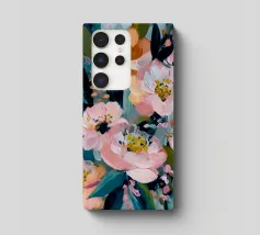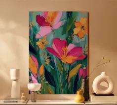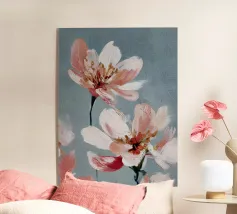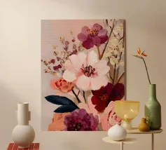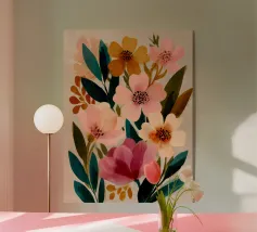 Delicati fiori rosa e foglie verde acqua si fondono in una composizione calma ed equilibrata. Questa stampa irradia grazia femminile e aggiunge un tocco di serenità a qualsiasi spazio abitativo.