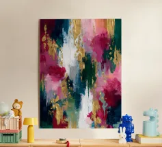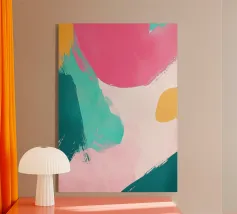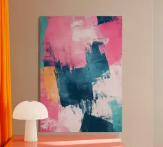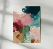 Pennellate strutturate nei toni del rosa, della salvia e della sabbia evocano paesaggi naturali. Una composizione tattile e rilassante che incarna il calore del minimalismo astratto.
