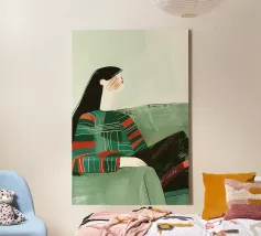 Un ritratto contemporaneo caratterizzato da moderazione e imperfezioni deliberate. Le proporzioni allungate e i tratti del viso semplificati creano una tensione silenziosa, mentre le pennellate visibili e le stratificazioni materiche conferiscono alla superficie una qualità grezza e tattile. I toni tenui della salvia dominano la composizione, interrotti da pennellate decise di rosso terracotta e nero intenso. Gli accenti lineari puliti contrastano con i gesti espressivi della pittura, bilanciando struttura e spontaneità. Il risultato è una presenza raffinata ma umana, composta, leggermente asimmetrica e volutamente incompiuta.