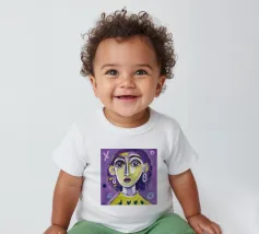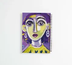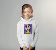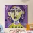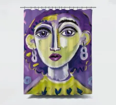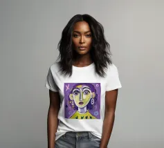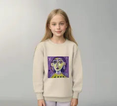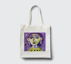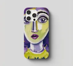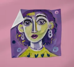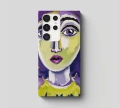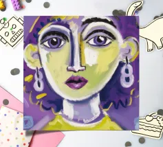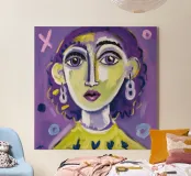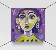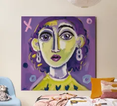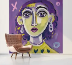 Questa opera d'arte mostra una persona con i capelli gialli e uno sfondo viola. Le forme e i motivi astratti conferiscono al dipinto una qualità onirica.