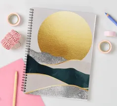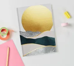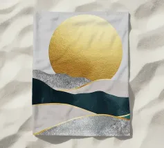 Paesaggio astratto con sole dorato e montagne blu-verdi, lamina dorata, sfondo grigio, stile illustrazione vettoriale, linee semplici, design piatto, texture disegnata a mano, dettagli semplici, stile artistico minimalista, pittura ad acquerello, spazio bianco sul lato sinistro dello schermo, alta risoluzione.